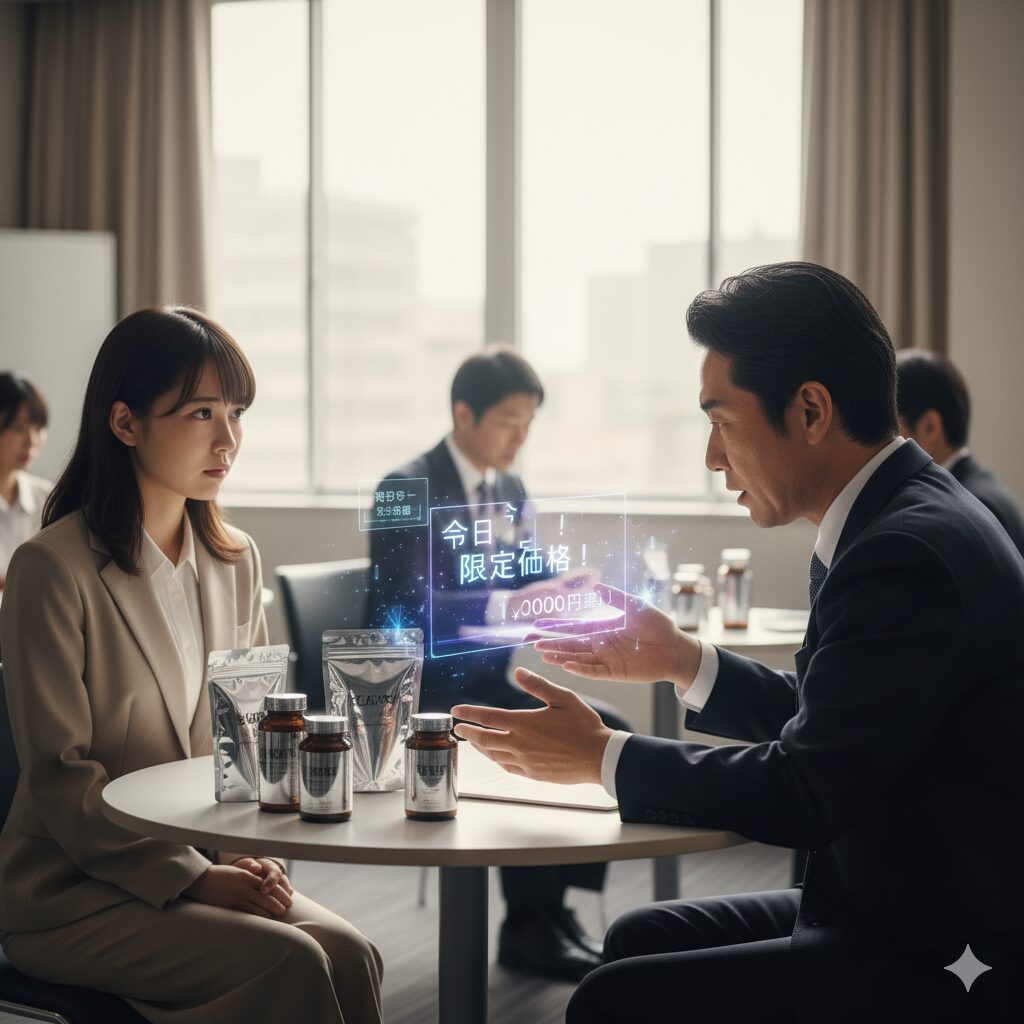 でも、セミナーの最後や、その後の「個別相談」で、「今日この会場だけの特別価格です!」って言って、高額なサプリメントや健康食品、浄水器みたいなものを勧められる…というパターンです。