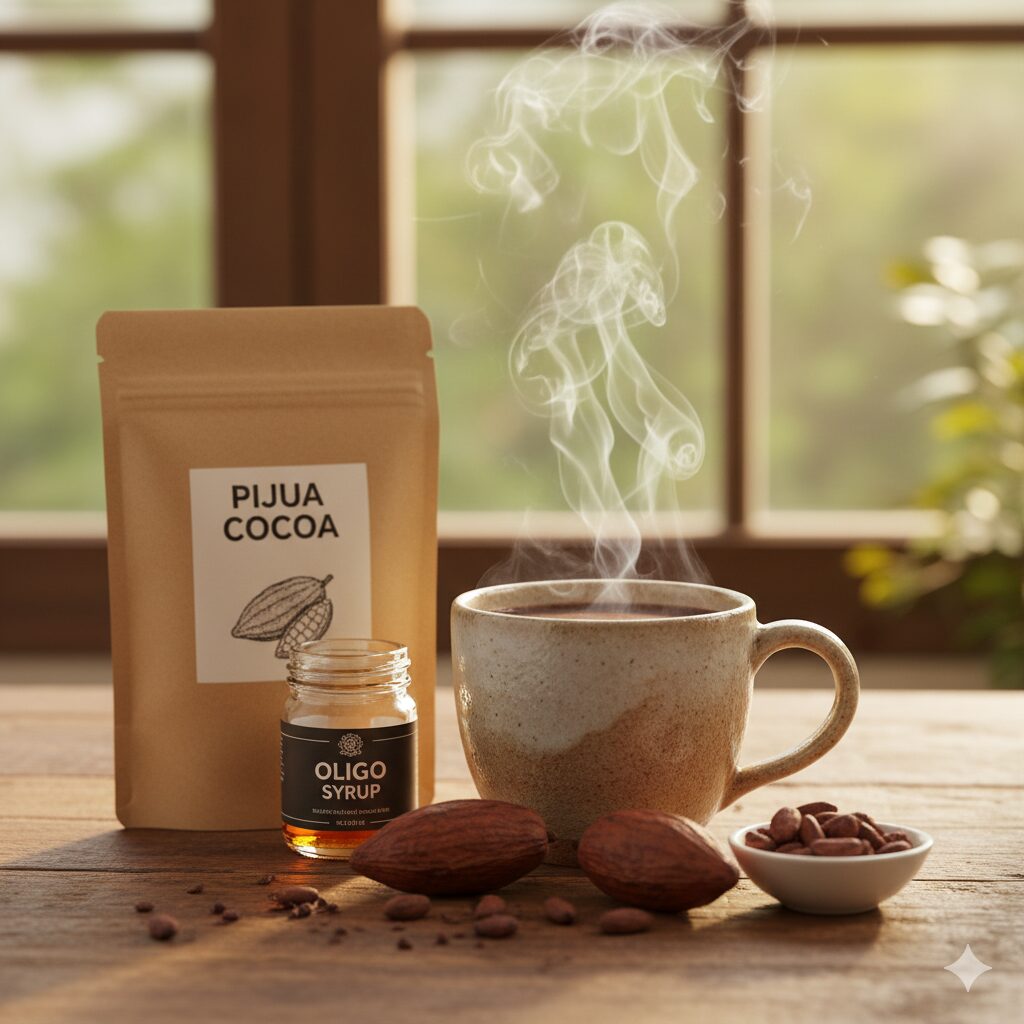 お湯でしっかり練って溶かしたピュアココアに、オリゴ糖シロップをお好みで加える。もし口当たりをまろやかにしたければ、無調整豆乳や、牛乳(乳糖でお腹がゴロゴロしない方なら)を少しだけ加えるのも良いかもです。